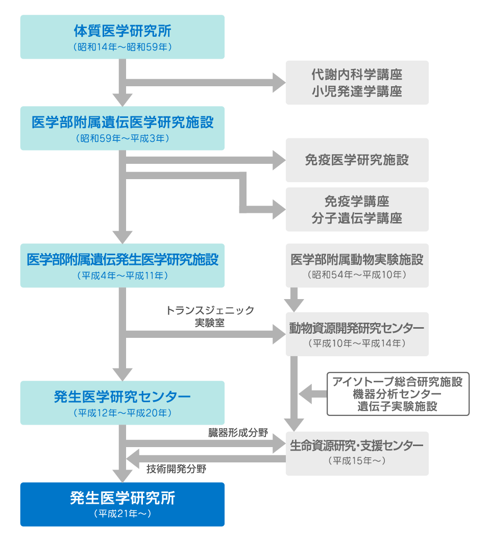 Institute of Molecular Embryology and Genetics was initially established in 1992, and extensively reorganized in both April, 2000 and April, 2009 having 3 divisions, 13 departments, and 2 laboratories as follows: Division of Developmental Regulation; Department of Medical Cell Biology, Department of Molecular Cell Biology, Department of Cell Maintenance, Department of Chromosome Biology, Department of Genomic Neurology: Division of Stem Cell Research; Department of Pluripotent Stem Cell Biology, Department of Cell Differentiation, Department of Cell Modulation, Laboratory of iPS Cell Research: Division of Organogenesis; Department of Brain Morphogenesis, Department of Kidney Development, Department of Germline Development, Department of Muscle Development and Regeneration, Department of Morphogenesis, Laboratory of Developmental Genetics. These departments take charge of education in the Graduate School of Medical Sciences or the Graduate School of Pharmaceutical Sciences in 2002.