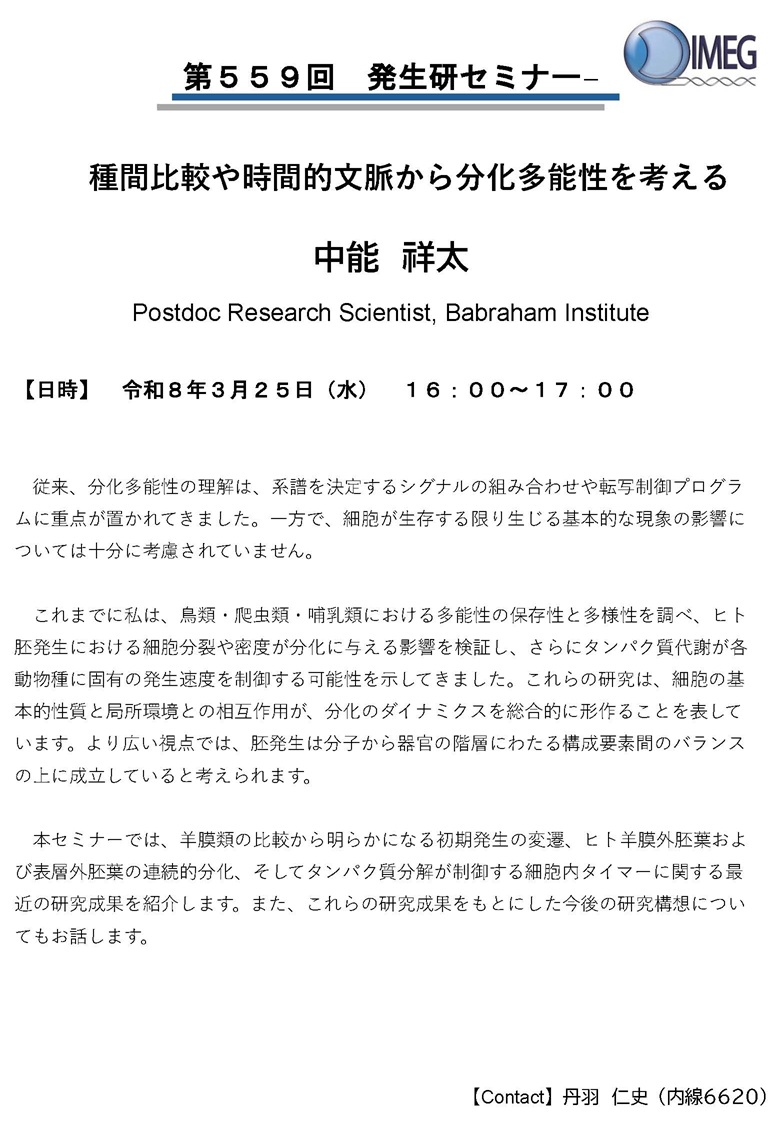 [発生研セミナー] 3/25 16:00- Babraham Institute 中能祥太先生