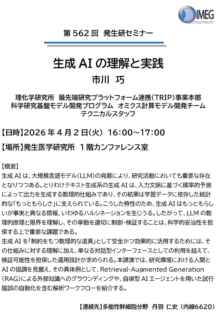 [発生研セミナー] 4/2 16:00- 理研 市川巧 氏